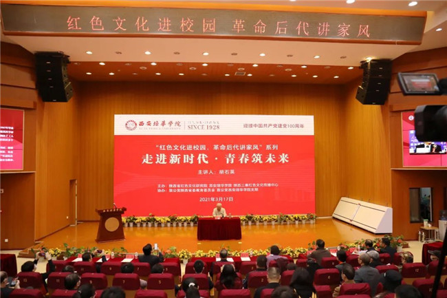 3月17日,由陕西省红色文化研究院、西安培华学院、陕西三秦红色文化传播中心主办,致公党陕西省委教育委员会,致公党西安培华学院支部协办的迎接建党100周年,“红色文化进校园,革命后代讲家风”系列活动在西安培华学院长安校区举行,本次活动邀请胡乔木同志之子、西安培华学院名誉校长胡石英为青年学子以《走进新时代,青春筑未来》主题讲述创新与梦想。活动由西安培华学院党委书记罗新远教授主持,陕西省红色文化研究院、致公党陕西省委教育委员会、致公党西安培华学院支部、曲江新区总支部代表以及培华师生聆听了报告。