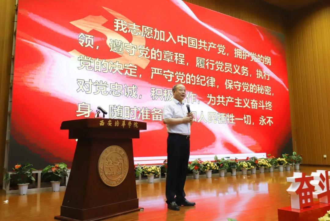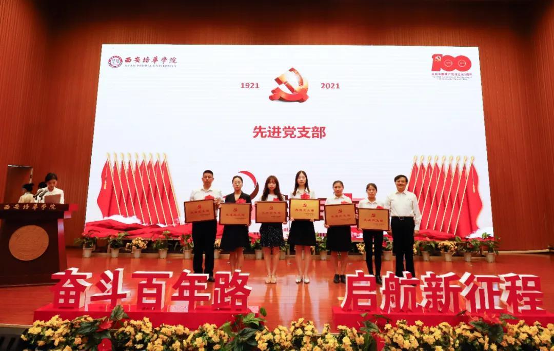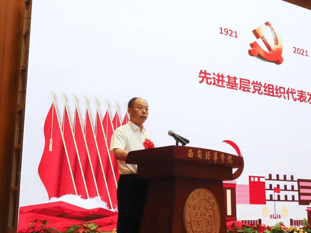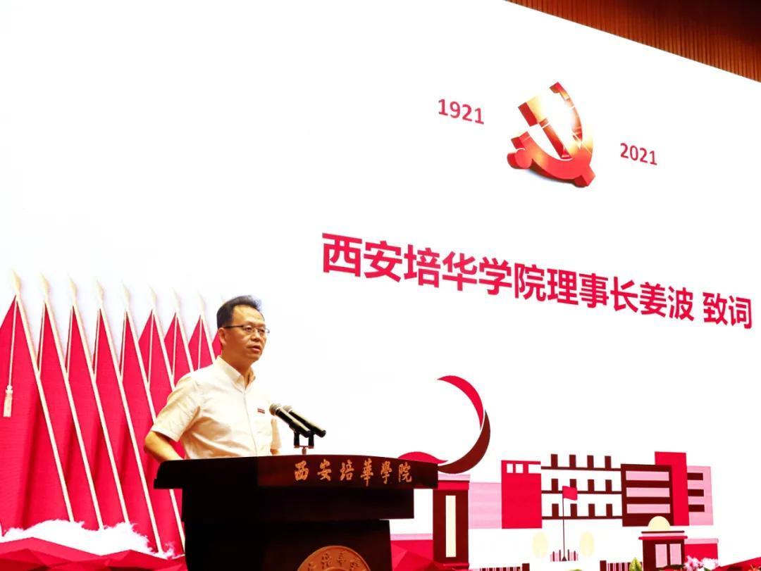奋斗百年路,启航新征程。为热烈庆祝中国共产党成立100周年,2021年7月9日上午,西安培华学院学习贯彻习近平总书记“七一”重要讲话精神暨表彰大会隆重召开。陕西省政协常委、致公党陕西省委会副主委、西安培华学院理事长姜波出席活动并讲话,学校党政领导班子成员,各基层党组织负责人,校工会委员会委员,各基层分会主席,各单位党务兼行政干事,受表彰的先进单位、优秀个人代表,参加宣誓的新党员代表以及师生党员代表参加了活动。
