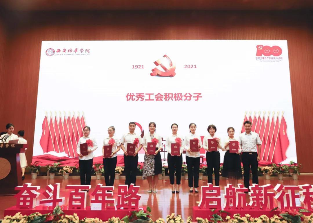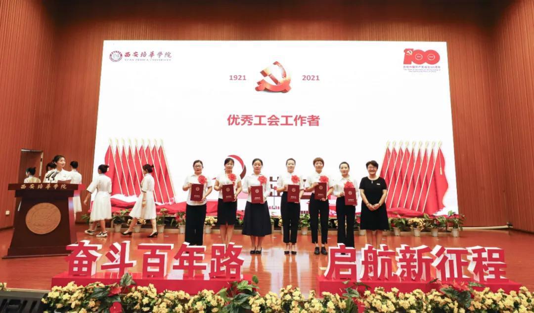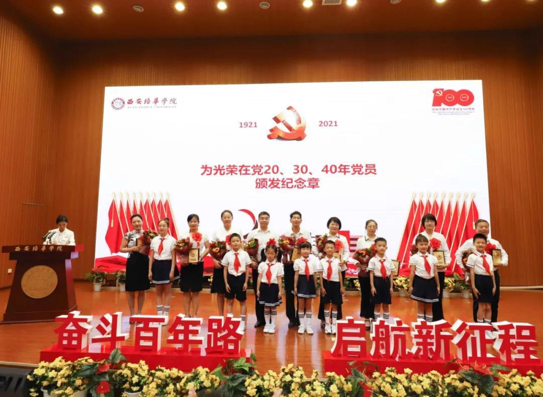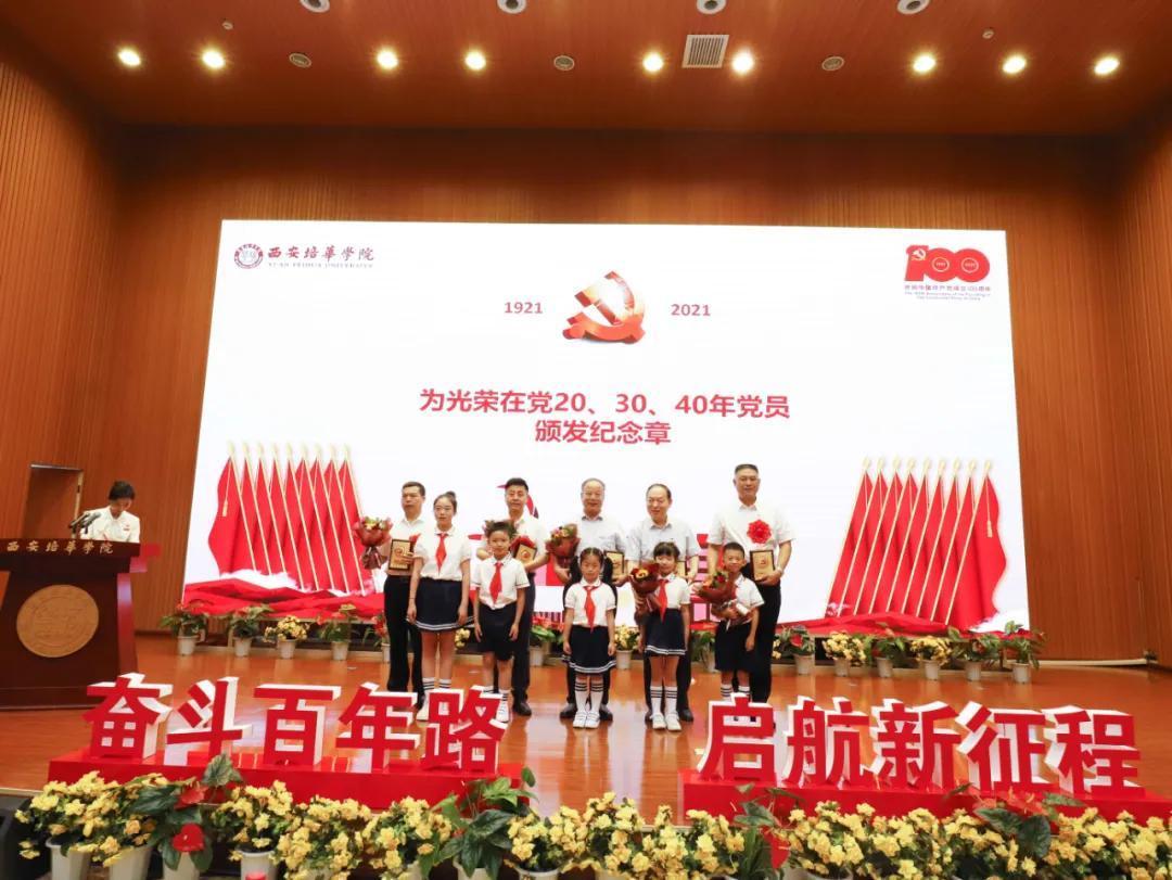 奋斗百年路,启航新征程。为热烈庆祝中国共产党成立100周年,2021年7月9日上午,西安培华学院学习贯彻习近平总书记“七一”重要讲话精神暨表彰大会隆重召开。陕西省政协常委、致公党陕西省委会副主委、西安培华学院理事长姜波出席活动并讲话,学校党政领导班子成员,各基层党组织负责人,校工会委员会委员,各基层分会主席,各单位党务兼行政干事,受表彰的先进单位、优秀个人代表,参加宣誓的新党员代表以及师生党员代表参加了活动。