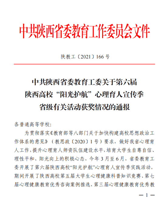 根据《中共陕西省委教育工委关于第六届陕西高校“阳光护航”心理育人宣传季省级有关活动获奖情况的通报》(陕教工〔2021〕166号)的文件,学校建筑与艺术设计学院辅导员赵煜柠的案例《上天会拯救我——一例大学生过度迷信错误认知咨询案例报告》荣获“陕西高校第七届心理健康教育优秀咨询案例三等奖”;潜能发展中心主任韩赟的教案《梦想与担当——职业价值观探索》荣获“陕西高校第三届心理健康教育优秀教案二等奖”,潜能发展中心吕改莲老师的教案《不负,不弃,让生命之花安然绽放——珍爱生命》荣获“陕西高校第三届心理健康教育优秀教案三等奖”;传媒学院党委副书记高嘉炜指导的情景剧《两个我》荣获“陕西高校第四届校园心理情景剧一等奖”,建筑与艺术设计学院党委书记兼行政副院长权勇太、建筑与艺术设计学院辅导员张庆莹指导的情景剧《因为我是党员》荣获“陕西高校第四届校园心理情景剧三等奖”。
