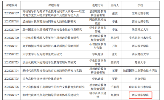 根据《关于公布2021年度陕西高校学生工作精品项目和研究课题立项名单的通知》的文件,西安培华学院党委学生工作部蔡亮主持的《三聚三融联动:红色基因融入大学生爱国主义教育实践研究》获得“学生工作精品项目”立项,传媒学院高嘉炜主持的《新时代陕西民办高校辅导员培训体系构建研究》获得“学生工作研究课题”立项。