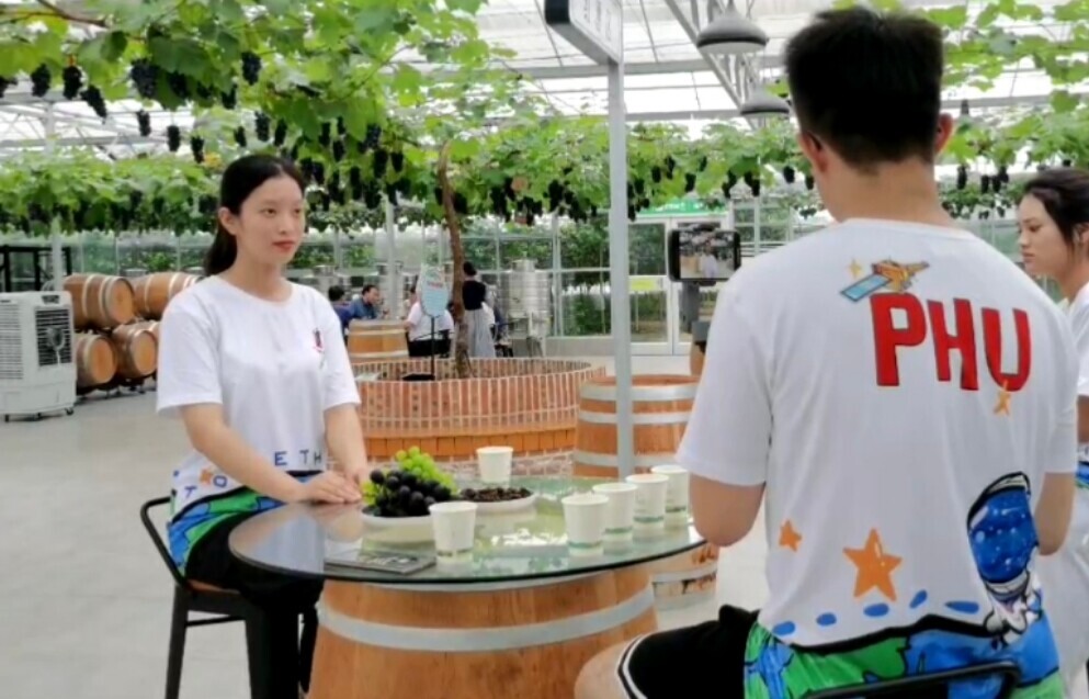 7月6日,西安培华学院传媒学院丝路携手乡村振兴实践队走进东海县石梁河镇帕蒂亚葡萄庄园。在葡萄温室里,映入眼帘的首先就是绿油油、整齐排列的葡萄架,紫葡萄、黑葡萄点缀在青葱的叶子之间,或直接显露在外,或羞答答的藏在叶下,很是惹人眼球,更是让人垂涎欲滴。实践队在这里将帮助园主采摘葡萄,直播讲解,录制宣传片等,他们将用自己的实际行动,传播庄园信息,让更多的人能发现这个庄园,从而提高葡萄销量。