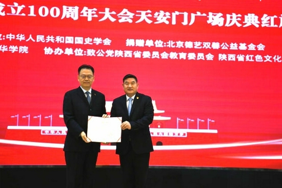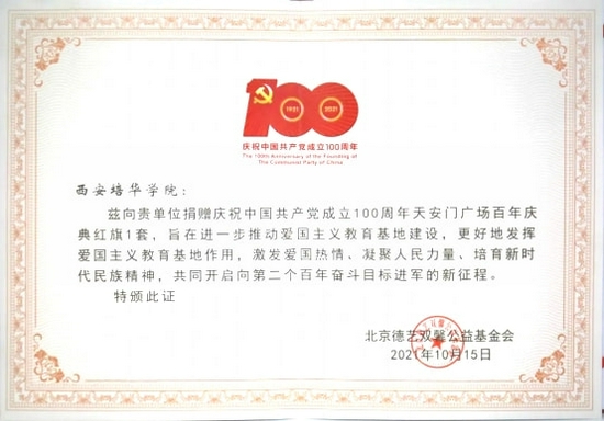 北京德艺双馨公益基金会向西安培华学院捐赠了一面天安门广场百年庆典红旗。全国政协委员、中华人民共和国国史学会秘书长张星星,陕西省十届人大常委会副主任邓理,中共陕西省委教育工作委员会、陕西省教育厅二级巡视员罗侃淳,北京德艺双馨公益基金会理事长范晓伟,北京德艺双馨公益基金会秘书长李杨,培华学院全体校领导及新生代表参加了捐赠仪式。