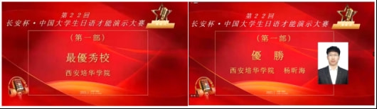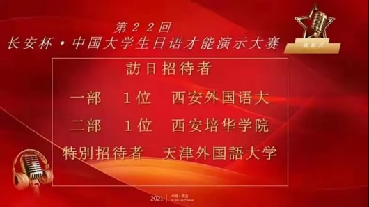 在10月30日举办的第22届“长安杯·中国大学生日语才能演示大赛”中,西安培华学院人文与国际教育学院外语系日语专业学生杨昕海凭借出色表现,荣获大赛乙组一等奖,西安培华学院荣获“最优秀学校奖”,西安培华学院日语专业教师小泽一博获得“优秀指导教师”。