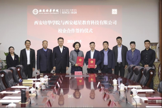为了实现校企双方资源共享,深化产教融合,促进教育链、人才链与产业链、创新链有机衔接,2021年11月5日下午,西安培华学院与西安超星教育科技有限公司于明德楼第一会议室举行了校企合作签约仪式。超星集团副总经理兼西安分公司总经理谢柯、副总经理董飞行、行业副总赵永兴、行业副总经理许增平、项目经理张科与西安培华学院理事长姜波、党委书记罗新远、副校长刘越莲、校长助理秦海锋及人文与国际教育学院相关领导、教师代表出席了仪式。