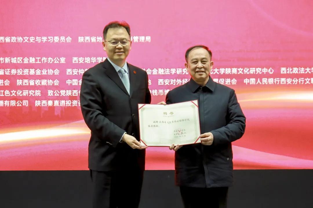 图/西安培华学院理事长姜波为西安地方金融协会会长王西省颁发客座教授聘书