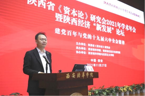 姜波理事长介绍了西安培华学院近年来所取得的各项优秀成果,及为陕西经济理论、学术研究、新经济人才的培养做出的贡献。表示此次陕西省《资本论》研究会主题鲜明,既是对中国共产党历经百年风雨的回顾,也是对陕西省在新时代面临的新发展、新挑战等问题的积极探究。为带动西安培华学院《资本论》的探索研究及马克思主义理论研究实现新的突破发挥了重要作用。