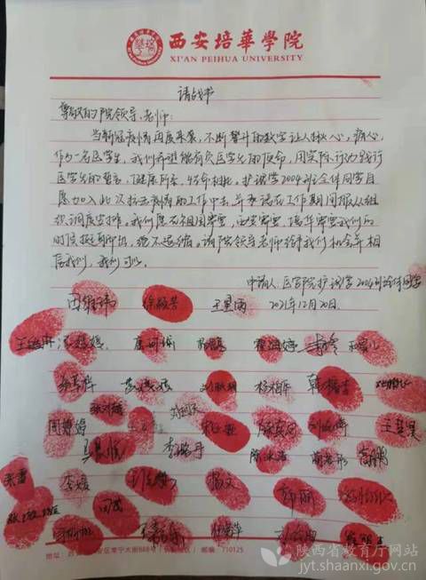 2021年12月20日上午,西安培华学院医学院护理学2004班的全体同学向学院递交了一封请战书,42个鲜红的手印、字字铿锵的誓言表示他们愿意主动加入抗击疫情的工作中去,并承诺在工作期间服从组织调度安排。这封请战书瞬间引爆网络,让人感受到陕西大学生的担当。