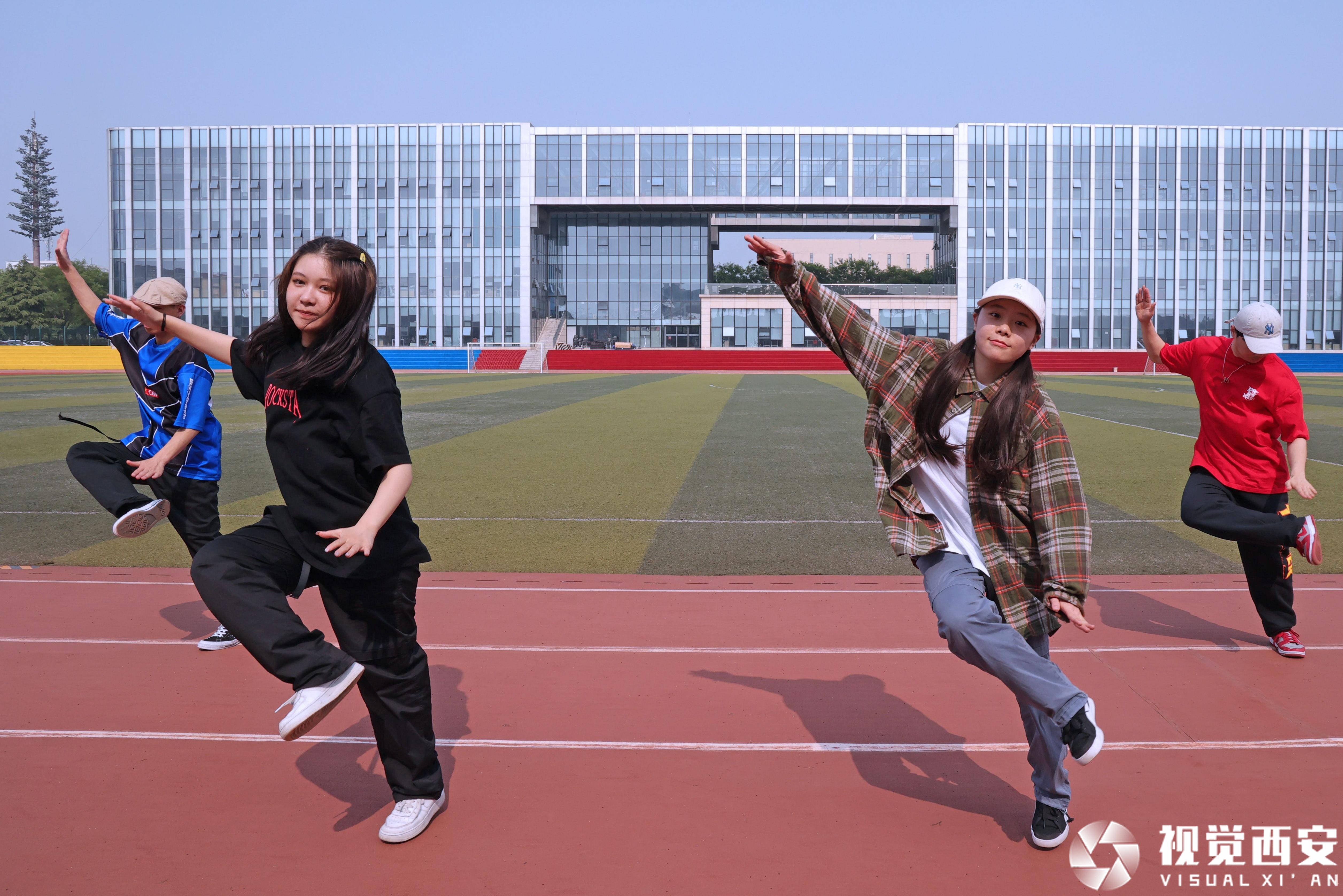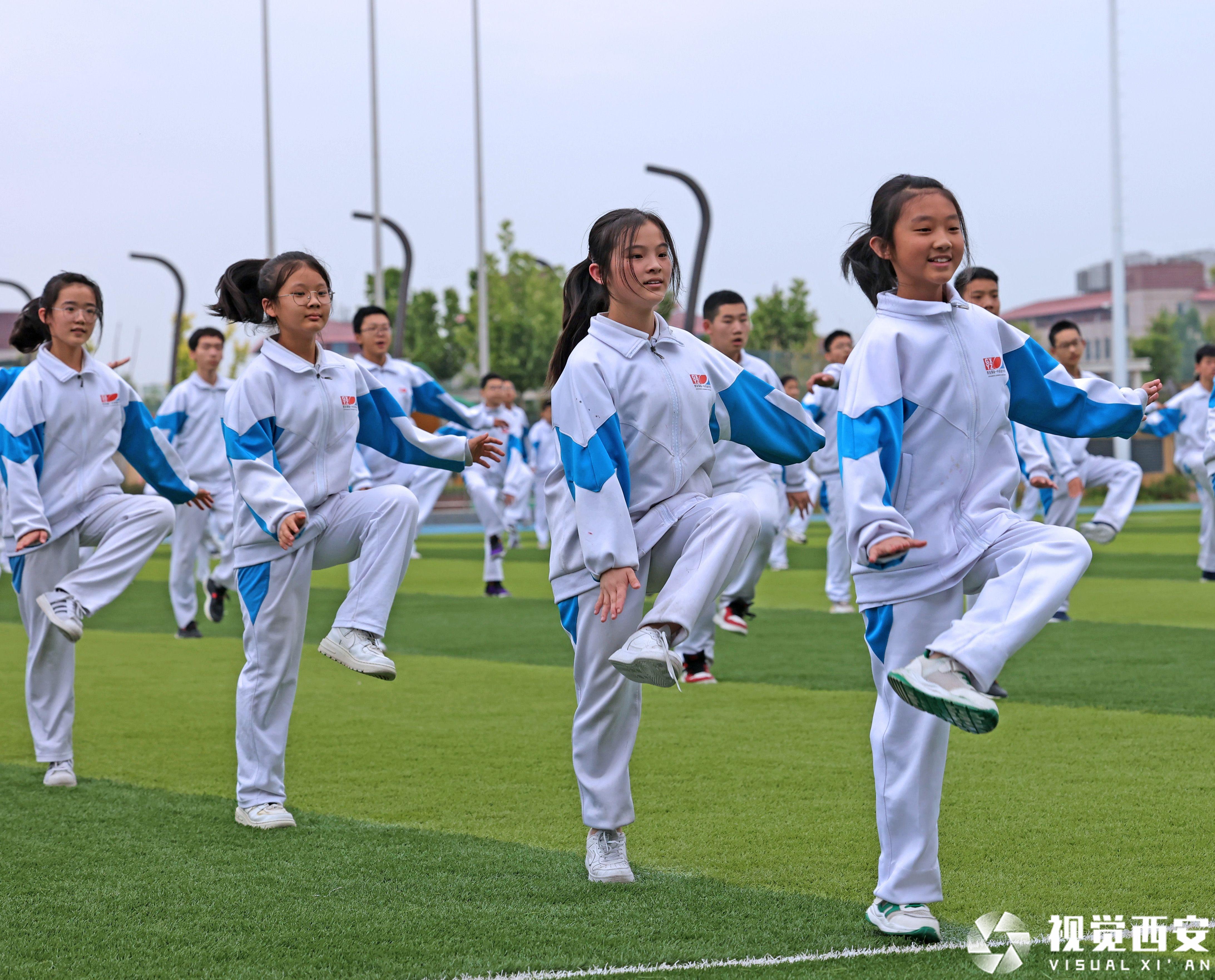 位于秦岭北麓、高新区未来中央创新区的西安高新一中实验中学,拥有优美的环境、清新的空气和绿色环保的现代化体育场馆设施,5月13日下午,当200余名初中学生共同跳起毽子操时,场面颇为壮观。该校七年级(初一)三班的吉烜宁和五班的宋舒维是住校生,每周只能在周末回家,不过,这对小姐妹均表示,通过课余时间和同学们一起跳毽子舞、打羽毛球,能让自己充分放松,“自习和运动结束后,我们每晚十点准时熄灯睡觉,第二天六点半起床,生活很规律、精力也特别充沛。”七年级二班的刘语涵是为数不多的走读生之一,虽比其他同学增加了一些奔波之苦,可她却笑着表示,如今学校在减轻学生课堂作业和课外培训负担方面做得很不错,“我们有不少时间可以参与自己喜欢的运动。除了组织大家学跳毽子操之外,学校还开设了游泳课、红拳课,也组建了健美操等体育社团,同学们都很喜欢。”