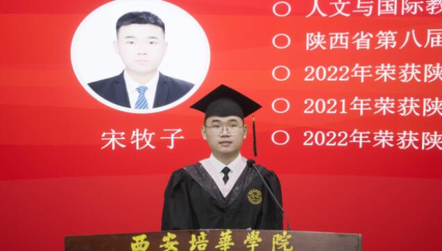 人文与国际教育学院法学专业宋牧子同学作为毕业生代表发言,他感谢了各位师长的真情陪伴和潜心育人,让他在奋斗和历练中不断蜕变成长。他回顾了在培华砥砺品格、锤炼意志的青春岁月以及在培华四年来取得的成就,表示毕业即将踏上人生新征程,将怀揣着对未来生活的向往,勇担时代使命,砥砺前行。最后他祝愿母校培育桃李扬四海,硕果累累振中华。