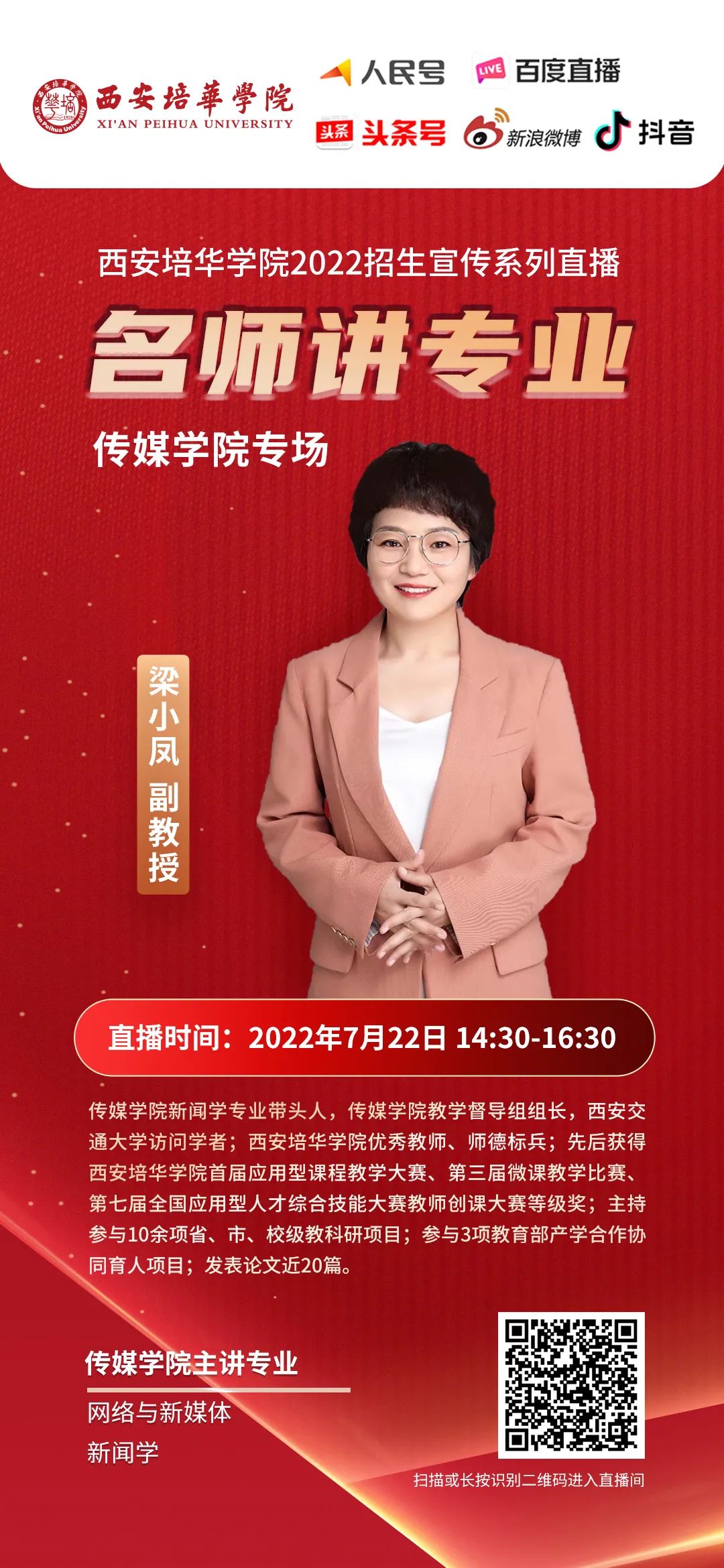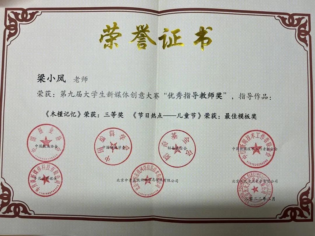 梁小凤副教授,新闻学专业带头人,兼任西安培华学院传媒学院教学督导组组长。2次获评西安培华学院毕业论文(毕业设计)优秀指导教师,1次获评西安培华学院师德标兵,4次获评西安培华学院优秀教师。先后获得西安培华学院首届应用型课程教学大赛、第三届微课教学比赛、第九届应用型课程教案比赛等级奖。主持、参与校级一般和重点教科研项目10余项。参与完成省级教学改革项目(包括子项目)2项、专业综合改革项目1项、重点专业建设1项。主持2项省级科研项目,参与8项省、市级科研项目,主持2项横向科研项目。参与3项教育部产学合作协同育人项目。发表英文论文2篇,北大核心期刊论文1篇,普刊论文15篇。获得国际创业中级教练资格,指导8个校级大学生创新创业项目、2个省级大学生创新创业项目。指导学生参加中国大学生新媒体创意大赛、大学生广告艺术大赛等大学生学科竞赛项目,学生获得一等奖二个、二等奖三个、优秀奖若干。