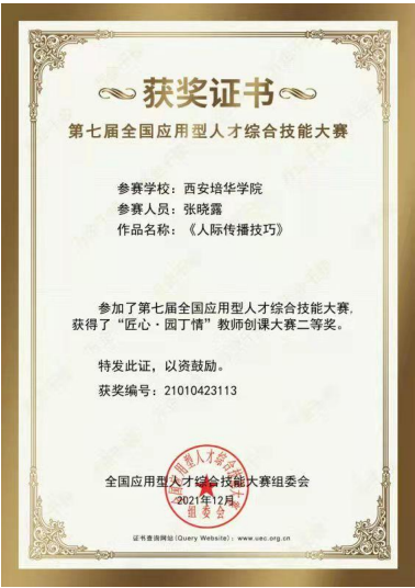 播音与主持艺术专业名列中国校友会《2017年播音与主持艺术专业高校排行榜》中国民办大学第三名,陕西民办大学第一名;校级一流本科专业。全国第四届中华职业教育创新创业大赛一等奖;第六届中国国际“互联网+”大学生创新创业大赛陕西赛区金奖兼最具人气奖;第十届“挑战杯”陕西省大学生创业计划竞赛金奖;丝路朗诵大赛一等奖。