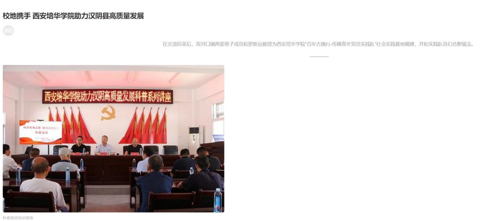 8月5日,西安培华学院赴汉阴县开展助力汉阴高质量发展“科学有效治理 助力乡村振兴”长安讲坛科普活动,西安培华学院党委书记、西安培华学院助力汉阴高质量发展课题组组长、陕西省乡村振兴专业研究会会长罗新远,团县委书记武进朝,汉阴县双河口镇纪委书记唐波,双河口镇副镇长,驻村工作队负责人李伟,校长办公室主任李健,校党委学工部部长蔡亮,团委书记杨媛,双河口镇幸和村两委会干部、村民代表及我校暑期“三下乡”社会实践队员代表,共计60人参加了此次科普活动。