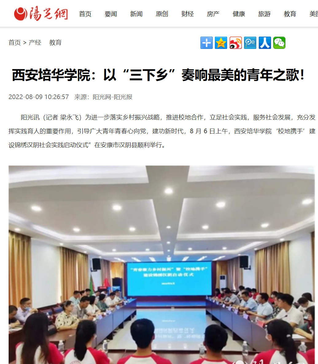 为进一步落实乡村振兴战略,推进校地合作,立足社会实践,服务社会发展,充分发挥实践育人的重要作用,引导广大青年青春心向党,建功新时代,8 月 6 日上午,西安培华学院‘校地携手’建设锦绣汉阴社会实践启动仪式”在安康市汉阴县顺利举行。