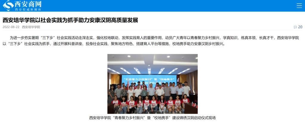 --投身社会实践,青年聚力乡村振兴。为积极助力乡村振兴,充分发挥新时代中国青年在服务基层发展、社会建设、乡村振兴的智慧力量,在安康团市委、汉阴县委县政府、乡村振兴局、团县委、县妇联等有关部门的大力支持下,西安培华学院围绕理论宣讲、法律科普、科技兴农、乡村健康、爱心支教、产业调研等实践方向,成立了西安培华学院青春聚力乡村振兴暑期“三下乡”汉阴专项实践团,下设28支实践服务队,实践足迹遍布汉阴县的 13个乡镇、28个村,服务村民近万人。在蓝天白云和绿水青山中,也留下了许多培华青年难忘的青春印迹。
