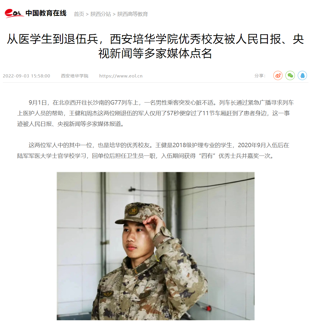 中国教育在线:从医学生到退伍兵,西安培华学院优秀校友被人民日报、央视新闻等多家媒体点名