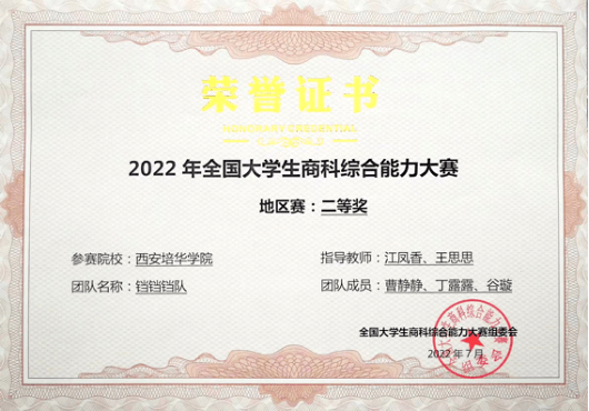 近日,由中国创造学会主办,同济大学经济与管理学院、上海策鸿信息科技有限公司、中国创造学会青年工作委员会承办的“2022年全国大学生商科综合能力大赛”圆满落幕。经过激烈角逐,在西安培华学院会计与金融学院江凤香、王芳、夏金、王思思老师的指导下,学校共有三支团队获奖。其中,叶红怡、郭银银、肖童宇同学所在团队获全国半决赛三等奖;丁杰、吴炜、李信哲同学,曹静静、丁露露、谷璇同学所在团队分别获得地区赛二等奖。