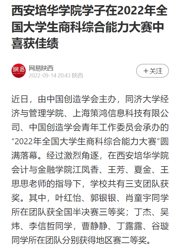 近日,由中国创造学会主办,同济大学经济与管理学院、上海策鸿信息科技有限公司、中国创造学会青年工作委员会承办的“2022年全国大学生商科综合能力大赛”圆满落幕。经过激烈角逐,在西安培华学院会计与金融学院江凤香、王芳、夏金、王思思老师的指导下,学校共有三支团队获奖。其中,叶红怡、郭银银、肖童宇同学所在团队获全国半决赛三等奖;丁杰、吴炜、李信哲同学,曹静静、丁露露、谷璇同学所在团队分别获得地区赛二等奖。