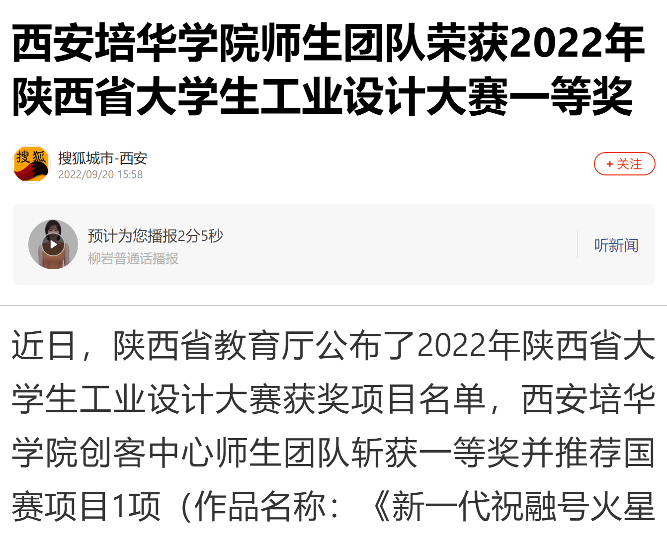据悉,陕西赛区共征集到有效参赛作品3302件,评选出一等奖作品30件、二等奖60件、三等奖90件、优秀奖120件,推荐国赛作品59件。全国大学生工业设计大赛为由教育部高等教育司指导,每两年举办一届,迄今已成功举办五届。本次大赛以“跨界共融·设计同行”为主题,倡导以工匠精神为核心的工业精神,引导参赛者树立崇高的理想和良好的职业道德,致力于培养崇尚劳动、敬业守信、精益求精、敢于创新的制造业领军人才。