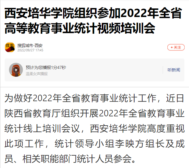 搜狐新闻:西安培华学院组织参加2022年全省高等教育事业统计视频培训会