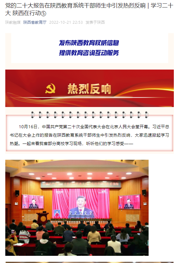 10月16日,中国共产党第二十次全国代表大会在北京人民大会堂开幕。习近平总书记在大会上作的报告在陕西教育系统干部师生中引发热烈反响,大家迅速掀起学习热潮。一起来看我省部分高校学习现场,听听他们的学习感受——