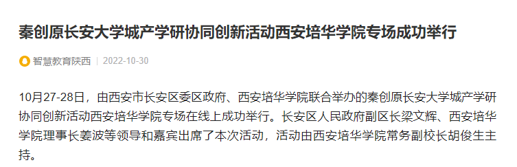 10月27-28日,由西安市长安区委区政府、西安培华学院联合举办的秦创原长安大学城产学研协同创新活动西安培华学院专场在线上成功举行。长安区人民政府副区长梁文辉、西安培华学院理事长姜波等领导和嘉宾出席了本次活动,活动由西安培华学院常务副校长胡俊生主持。