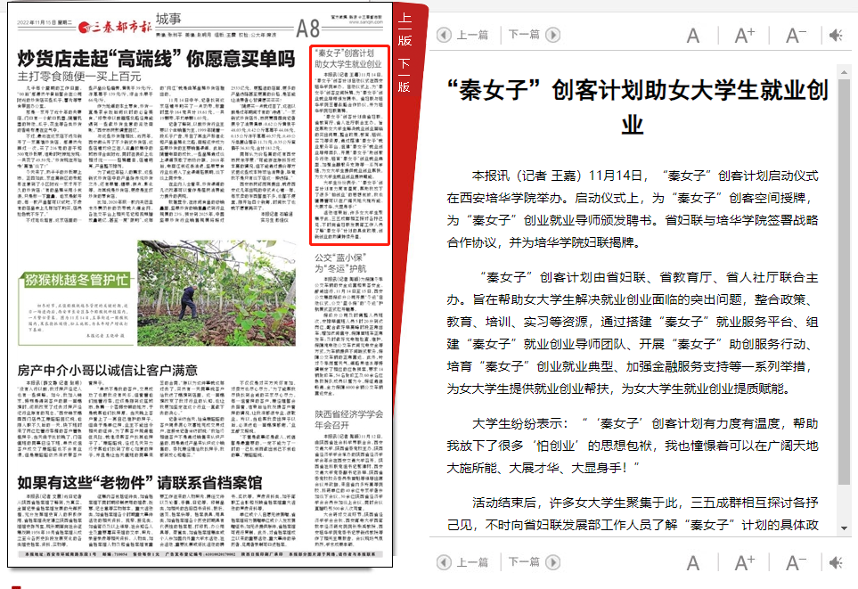 11月14日,“秦女子”创客计划启动仪式在西安培华学院举办。启动仪式上,为“秦女子”创客空间授牌,为“秦女子”创业就业导师颁发聘书。省妇联与培华学院签署战略合作协议,并为培华学院妇联揭牌。