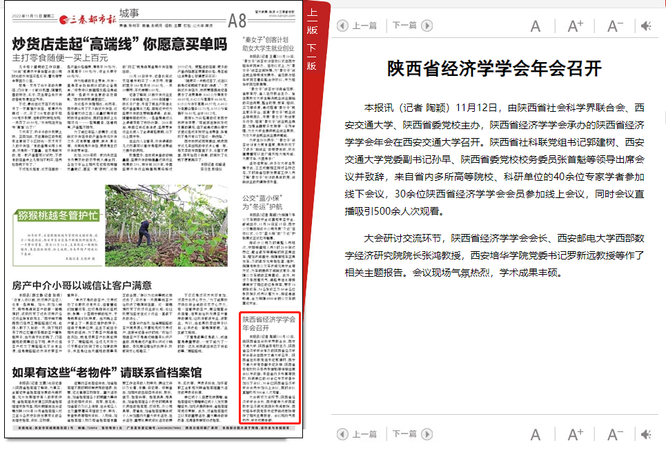 11月12日,由陕西省社会科学界联合会、西安交通大学、陕西省委党校主办,陕西省经济学学会承办的陕西省经济学学会年会在西安交通大学召开。陕西省社科联党组书记郭建树、西安交通大学党委副书记孙早、陕西省委党校校务委员张首魁等领导出席会议并致辞,来自省内多所高等院校、科研单位的40余位专家学者参加线下会议,30余位陕西省经济学学会会员参加线上会议,同时会议直播吸引500余人次观看。