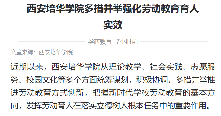 近期以来,西安培华学院从理论教学、社会实践、志愿服务、校园文化等多个方面统筹谋划,积极协调,多措并举推进劳动教育方式创新,把握新时代学校劳动教育的基本方向,发挥劳动育人在落实立德树人根本任务中的重要作用。