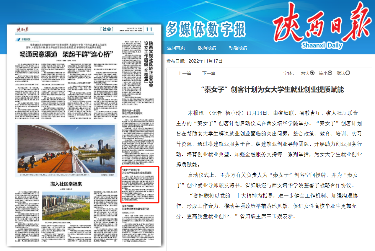 11月14日,由省妇联、省教育厅、省人社厅联合主办的“秦女子”创客计划启动仪式在西安培华学院举办。“秦女子”创客计划旨在帮助女大学生解决就业创业面临的突出问题,整合政策、教育、培训、实习等资源,通过搭建就业服务平台、组建就业创业导师团队、开展助力创业服务行动、培育创业就业典型、加强金融服务支持等一系列举措,为女大学生就业创业提质赋能。