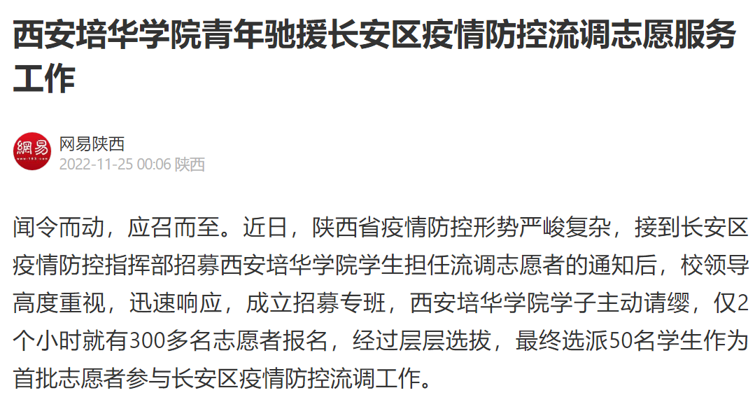 闻令而动,应召而至。近日,陕西省疫情防控形势严峻复杂,接到长安区疫情防控指挥部招募西安培华学院学生担任流调志愿者的通知后,校领导高度重视,迅速响应,成立招募专班,西安培华学院学子主动请缨,仅2个小时就有300多名志愿者报名,经过层层选拔,最终选派50名学生作为首批志愿者参与长安区疫情防控流调工作。