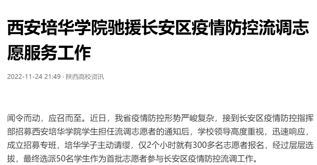 闻令而动,应召而至。近日,陕西省疫情防控形势严峻复杂,接到长安区疫情防控指挥部招募西安培华学院学生担任流调志愿者的通知后,校领导高度重视,迅速响应,成立招募专班,西安培华学院学子主动请缨,仅2个小时就有300多名志愿者报名,经过层层选拔,最终选派50名学生作为首批志愿者参与长安区疫情防控流调工作。