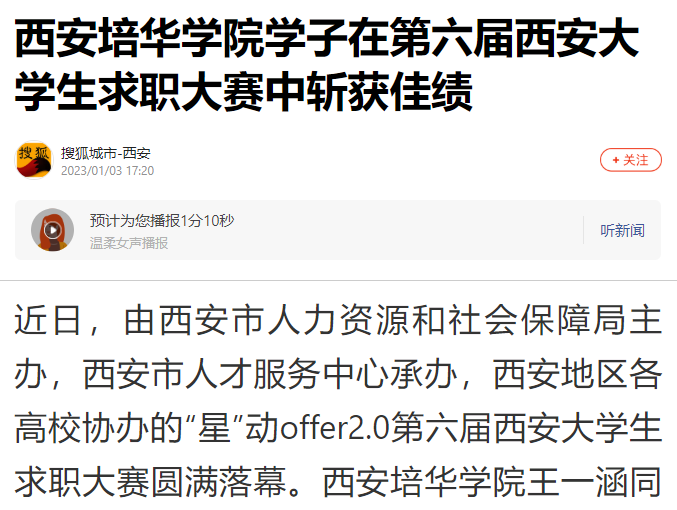近日,由西安市人力资源和社会保障局主办,西安市人才服务中心承办,西安地区各高校协办的“星”动offer2.0第六届西安大学生求职大赛圆满落幕。西安培华学院王一涵同学荣获“本专科组风采奖”,薛文静、翟梦瑶、马雨欣同学荣获“本专科组优秀奖”,招生与就业指导中心崔佳雯老师获得“优秀指导老师”称号,西安培华学院荣获“优秀组织单位”称号。