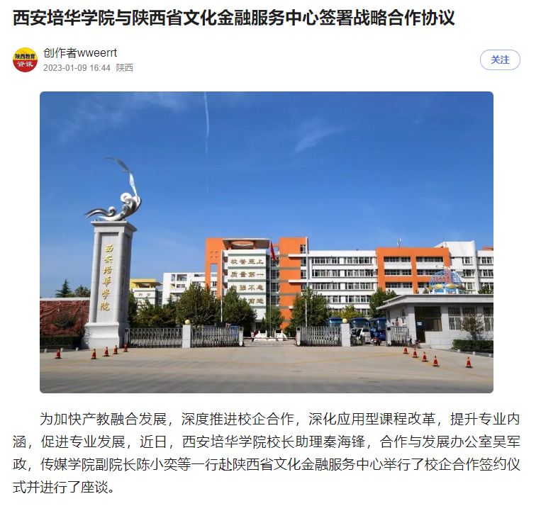 据介绍,西安培华学院与陕西省文化金融服务中心达成友好战略合作,双方将抓住此次契机,打造产教融合命运共同体,为陕西文化事业和文化产业发展持续赋能。