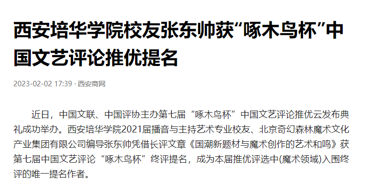 近日,中国文联、中国评协主办第七届“啄木鸟杯”中国文艺评论推优云发布典礼成功举办。西安培华学院2021届播音与主持艺术专业校友、北京奇幻森林魔术文化产业集团有限公司编导张东帅凭借长评文章《国潮新题材与魔术创作的艺术和鸣》获第七届中国文艺评论“啄木鸟杯”终评提名,成为本届推优评选中(魔术领域)入围终评的唯一提名作者。