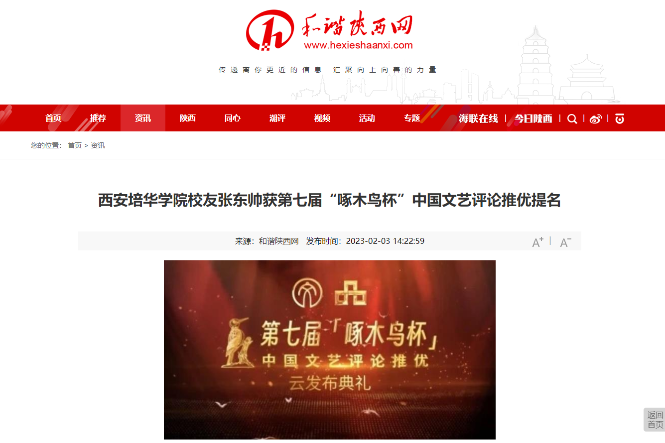 近日,中国文联、中国评协主办第七届“啄木鸟杯”中国文艺评论推优云发布典礼成功举办。西安培华学院2021届播音与主持艺术专业校友、北京奇幻森林魔术文化产业集团有限公司编导张东帅凭借长评文章《国潮新题材与魔术创作的艺术和鸣》获第七届中国文艺评论“啄木鸟杯”终评提名,成为本届推优评选中(魔术领域)入围终评的唯一提名作者。