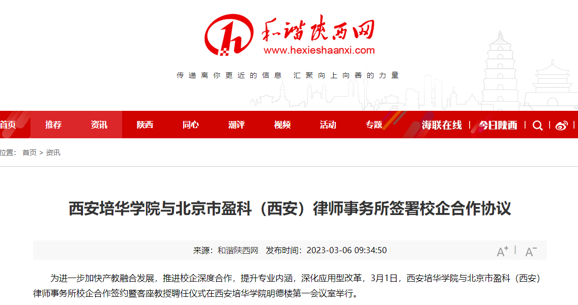 为进一步加快产教融合发展,推进校企深度合作,提升专业内涵,深化应用型改革,3月1日,西安培华学院与北京市盈科(西安)律师事务所校企合作签约暨客座教授聘任仪式在西安培华学院明德楼第一会议室举行。