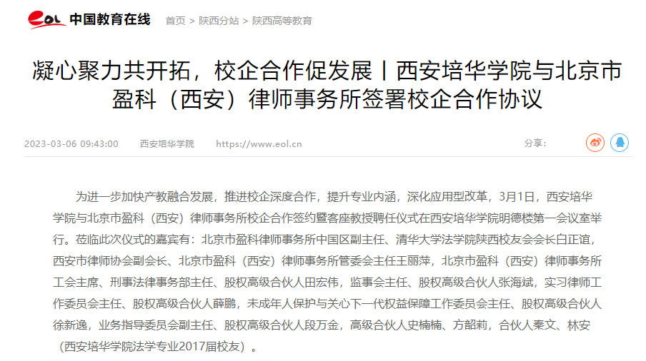 中国教育在线:凝心聚力共开拓,校企合作促发展丨西安培华学院与北京市盈科(西安)律师事务所签署校企合作协议