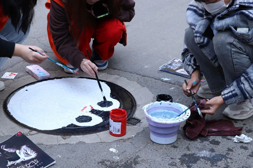 建筑与艺术设计学院的志愿者利用所学专业知识,手拿彩绘工具,以井盖为画布,认真勾勒图案,专心填充颜色,给灰突突的井盖也穿上了“新衣”,让原本沉寂的沥青道路增添了不少生机与活力。
