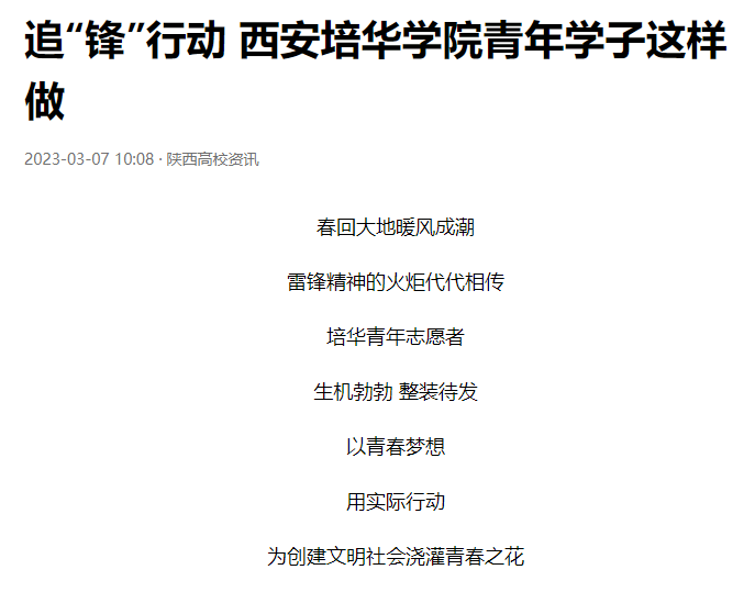 近年来,西安培华学院始终把青年志愿者行动摆在学校发展的工作大局中进行谋划和推进,以“实践育人”为切入点,不断拓宽志愿服务领域,形成覆盖广泛、内容丰富、具有较高专业水准的志愿服务项目体系。