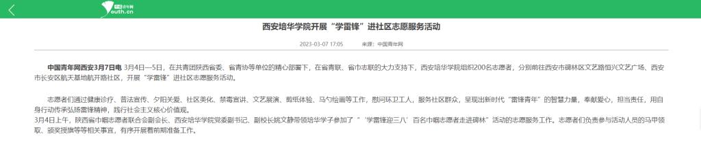 中国青年网西安3月7日电3月4日—5日,在共青团陕西省委、省青协等单位的精心部署下,在省青联、省巾志联的大力支持下,西安培华学院组织200名志愿者,分别前往西安市碑林区文艺路恒兴文艺广场、西安市长安区航天基地航开路社区,开展“学雷锋”进社区志愿服务活动。
