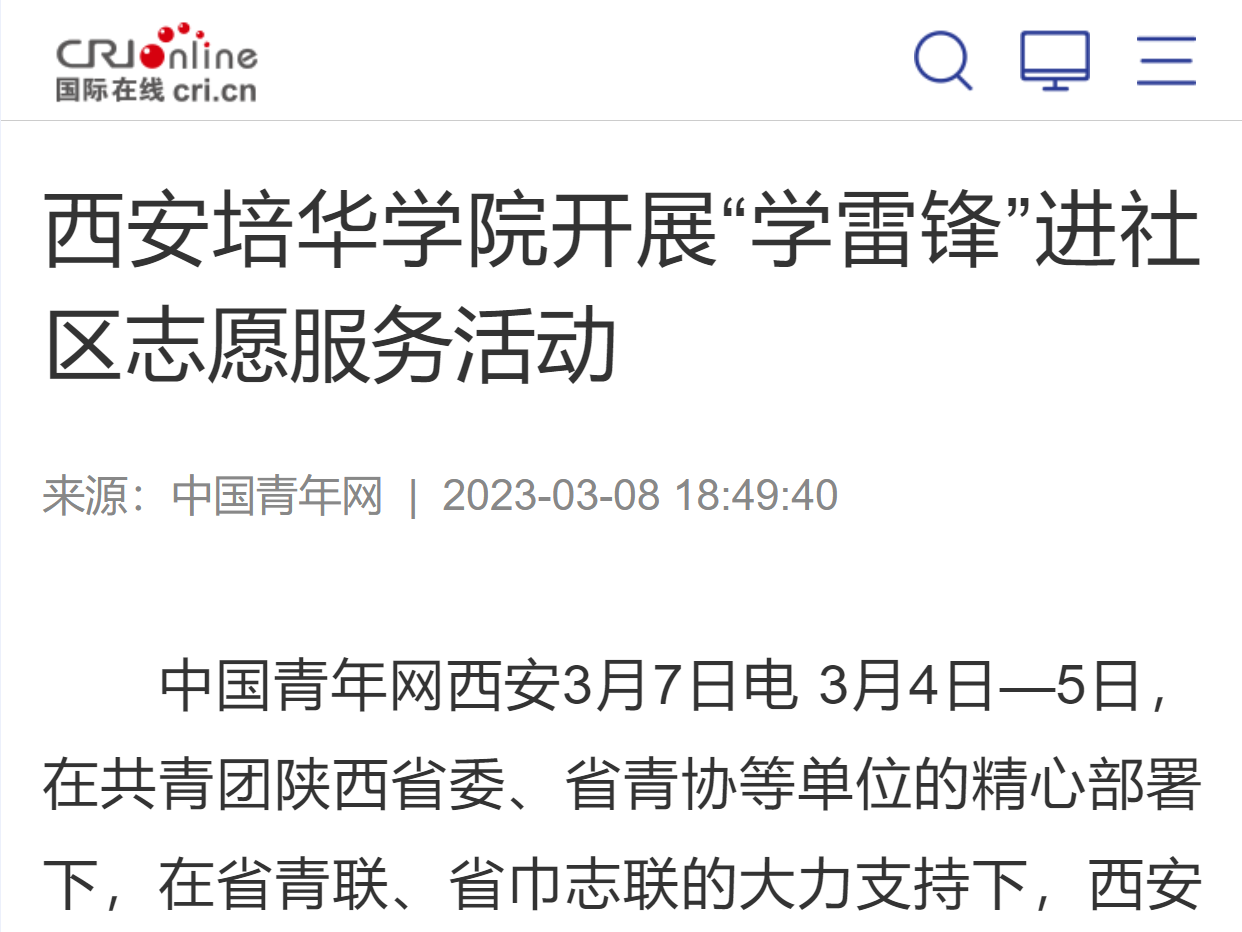 近年来,西安培华学院始终把青年志愿者行动摆在学校发展的工作大局中进行谋划和推进,以“实践育人”为切入点,不断拓宽志愿服务领域,形成覆盖广泛、内容丰富、具有较高专业水准的志愿服务项目体系。