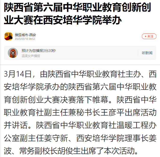 搜狐新闻:陕西省第六届中华职业教育创新创业大赛在西安培华学院举办