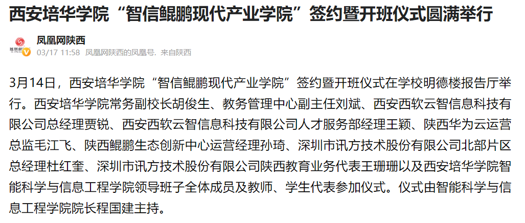 凤凰新闻:西安培华学院“智信鲲鹏现代产业学院”签约暨开班仪式圆满举行
