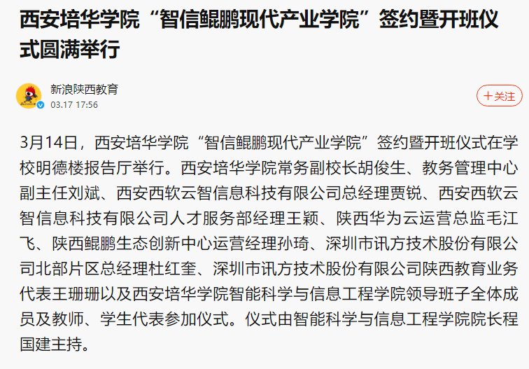 新浪新闻:西安培华学院“智信鲲鹏现代产业学院”签约暨开班仪式圆满举行