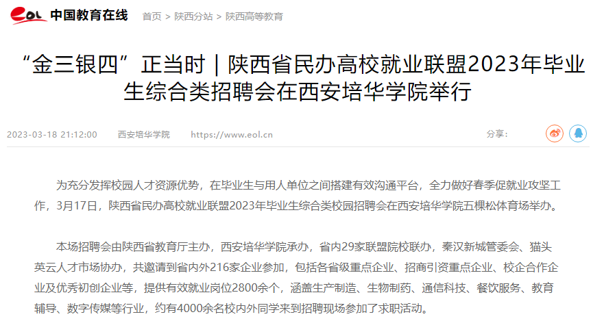 本次民办高校就业联盟招聘会是国家防疫“新十条”出台以来,西安培华学院举办的首场线下招聘会,也是民办高校就业联盟成立以来举办的第九场大型综合类招聘会。西安培华学院致力于帮助毕业生抓住春季求职“黄金期”,促进每位毕业生实现充分高质量就业。