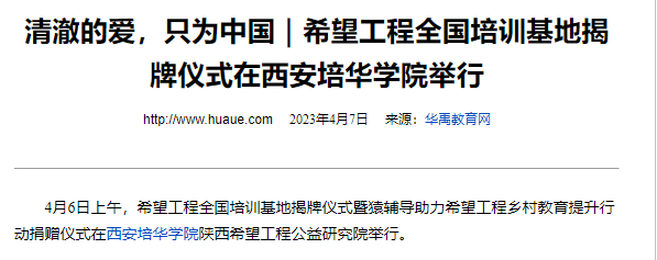 4月6日上午,希望工程全国培训基地揭牌仪式暨猿辅导助力希望工程乡村教育提升行动捐赠仪式在西安培华学院陕西希望工程公益研究院举行。