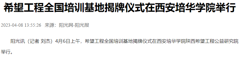 阳光讯(记者 刘杰)4月6日上午,希望工程全国培训基地揭牌仪式在西安培华学院陕西希望工程公益研究院举行。