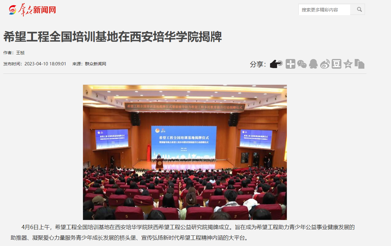 4月6日上午,希望工程全国培训基地在西安培华学院陕西希望工程公益研究院揭牌成立。旨在成为希望工程助力青少年公益事业健康发展的助推器、凝聚爱心力量服务青少年成长发展的桥头堡、宣传弘扬新时代希望工程精神内涵的大平台。