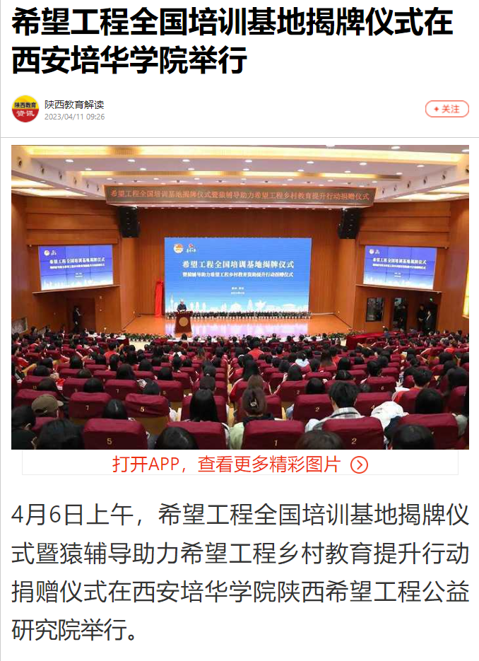 搜狐新闻:希望工程全国培训基地揭牌仪式在西安培华学院举行